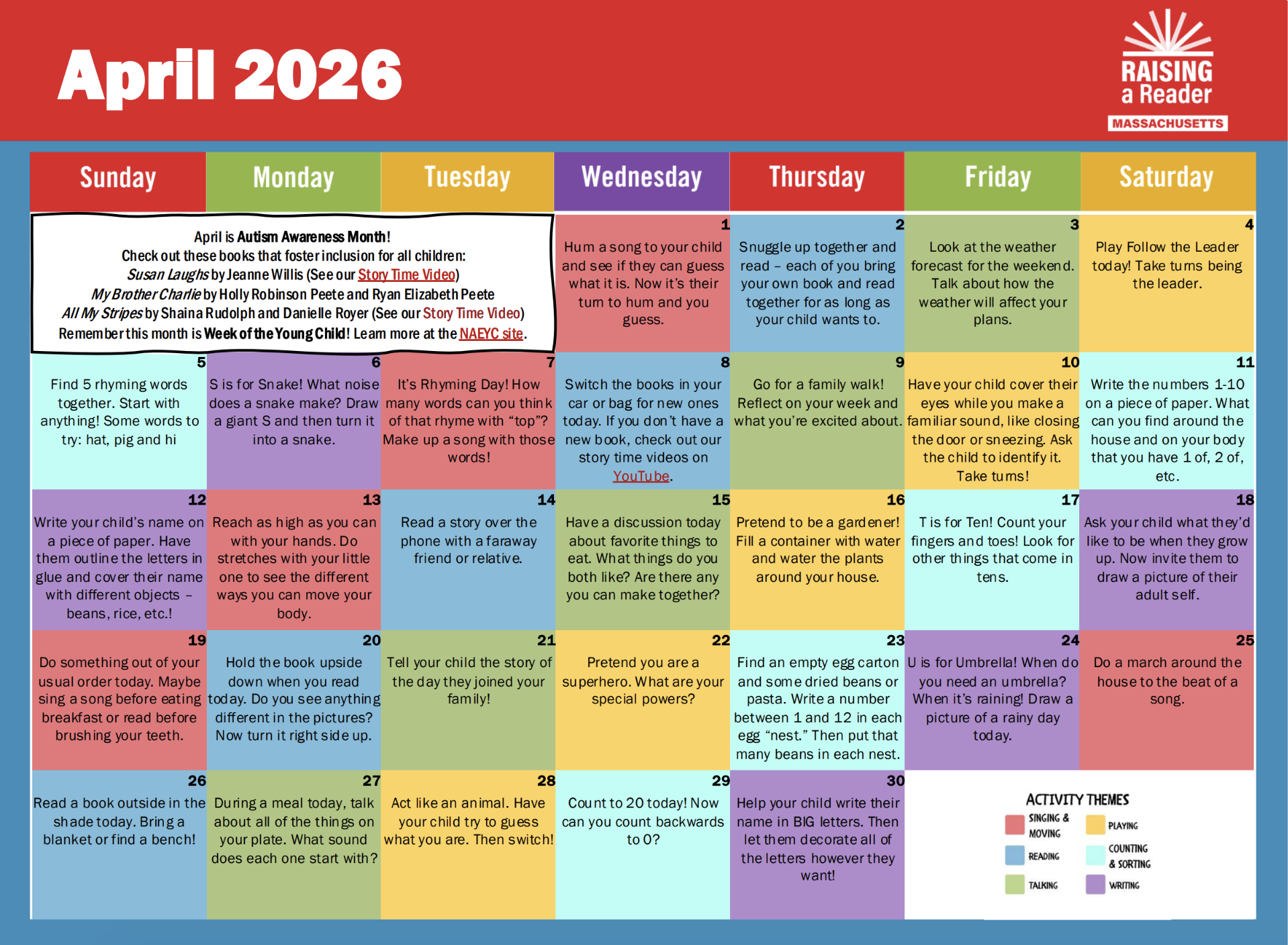 Check out our printable calendar for daily tips and activities to do with your little ones throughout the year. Use this calendar as a guide to help create a literacy-rich environment for you and your family!